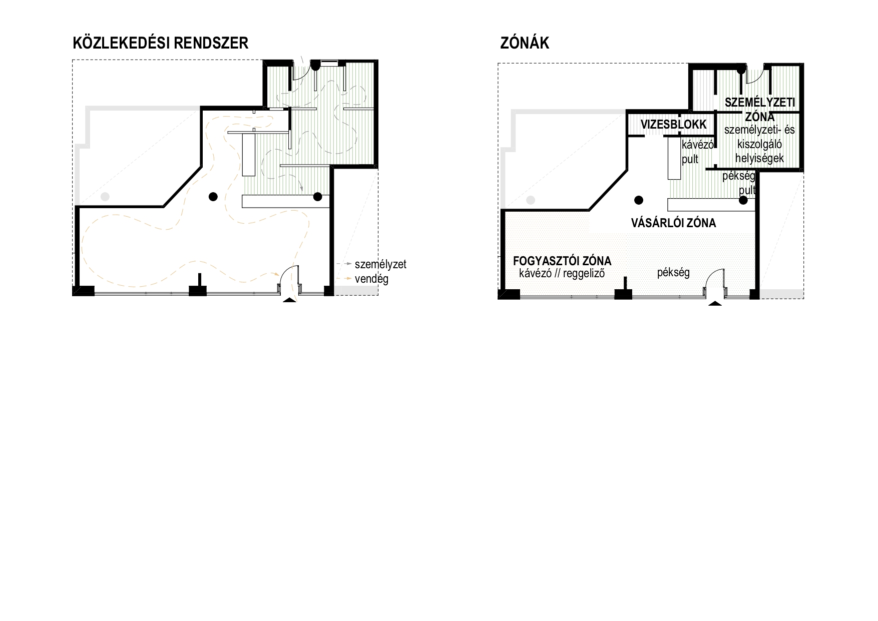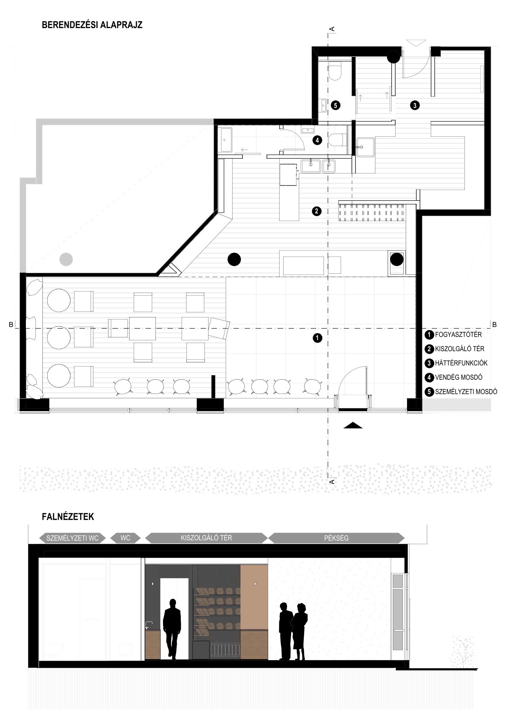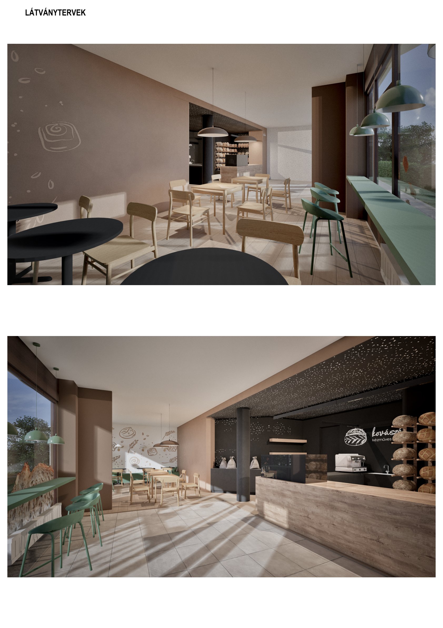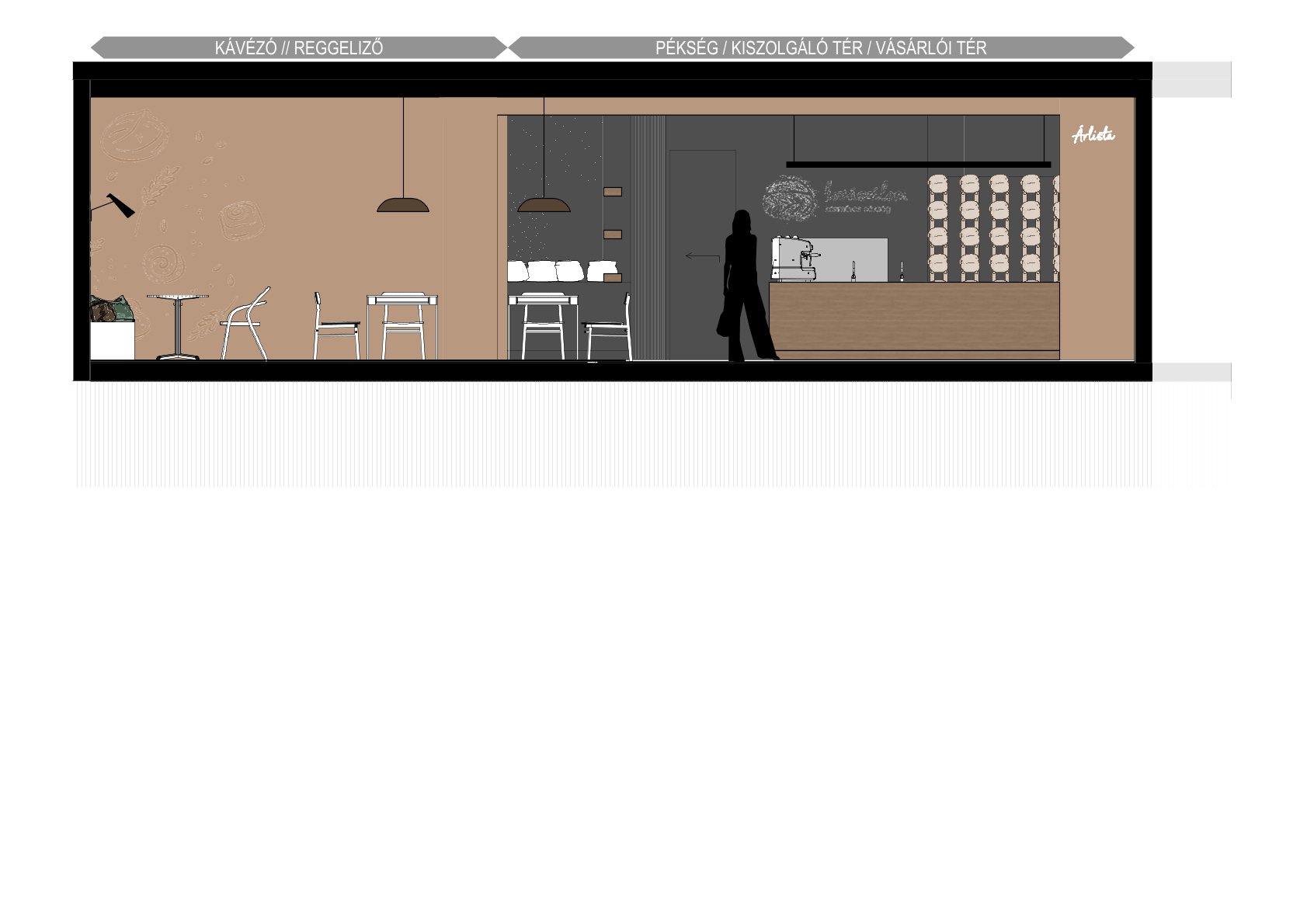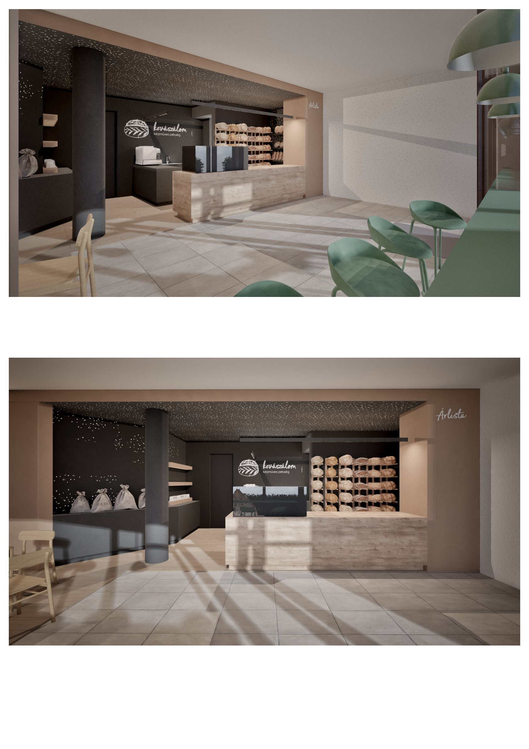 Kaposvár belvárosában egy pékség és kávézó belsőépítészeti kialakítását terveztük meg. A meglévő arculati elemeket a színhasználat és grafikai megoldások integrálásával emeltük be a térbe, alapot teremtve a későbbi üzletek egységes megjelenéséhez. A meglévő geometria logikus kihasználásával világosan elkülönítettük a vásárlói és személyzeti útvonalakat, miközben a kis alapterületű háttérfunkciókat ésszerűen szerveztük. Az egy légtérű kiszolgáló térben a pékség és kávézó funkciók rugalmasan működnek, a pult és a fogyasztótér vizuális elválasztásával átlátható üzletteret létrehozva.